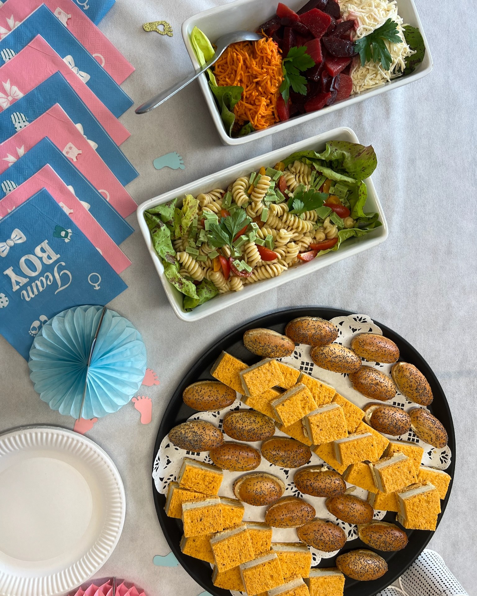 La demande : créer une ambiance chaleureuse et festive autour d’un brunch complet, d’animations personnalisées et d’une décoration sur le thème « Baby Shower bleu/rose ».